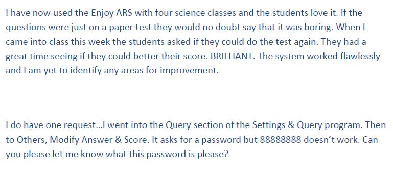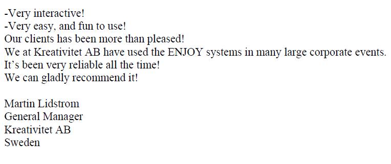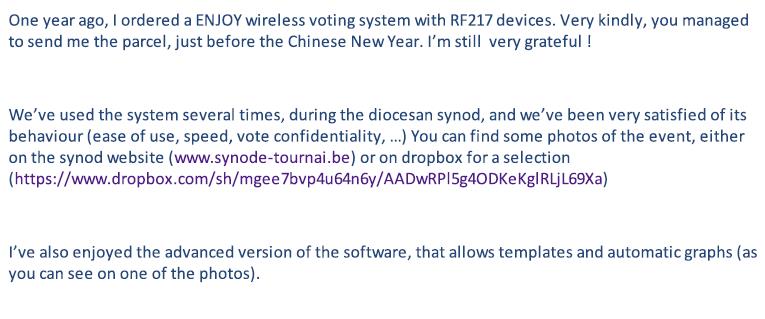 2015年6月2日ENJOY voting system already have 14 years history (till 2015). We have got a lot of feedback from our customer, not only distributors but end users, not only event users but teachers. You may see below.